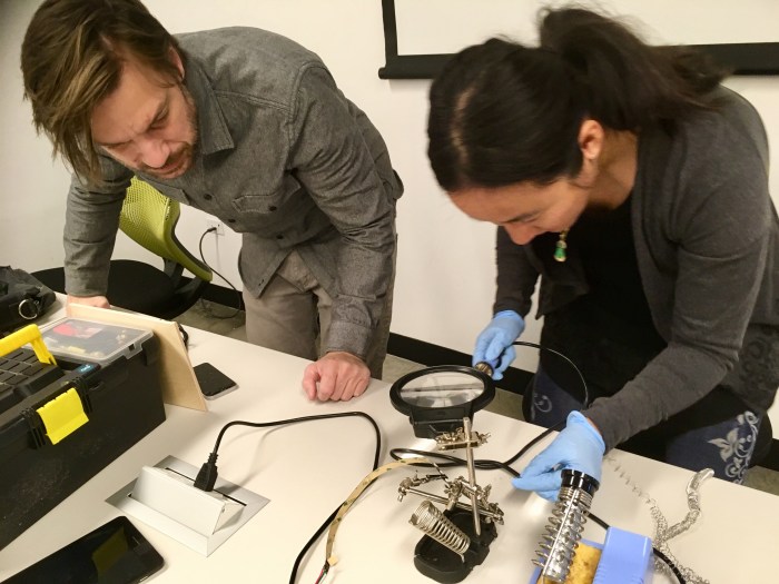 I requested soldering lessons from Jason, who teaches the Innovation Fabrication 1 class. I can soldered metal alloy on LED lights onto dupont wires for the first time. For my next creation, I am soldering an Adafruit to add lighting to my display.